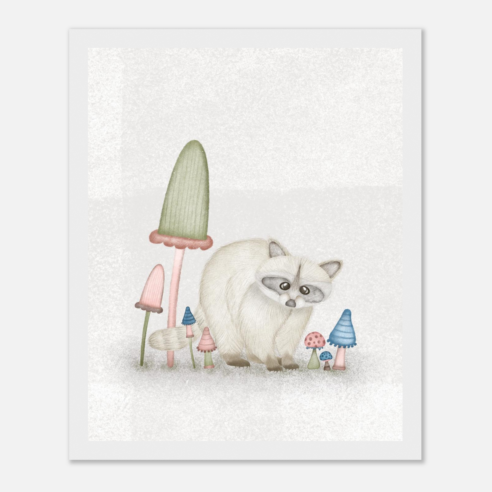 Sturdy and ready-to-hang wooden framed racoon frolicking in mushroom forest illustration printed on premium semi-glossy paper that enhances colours with a subtle shine while protecting against fading from light and moisture.