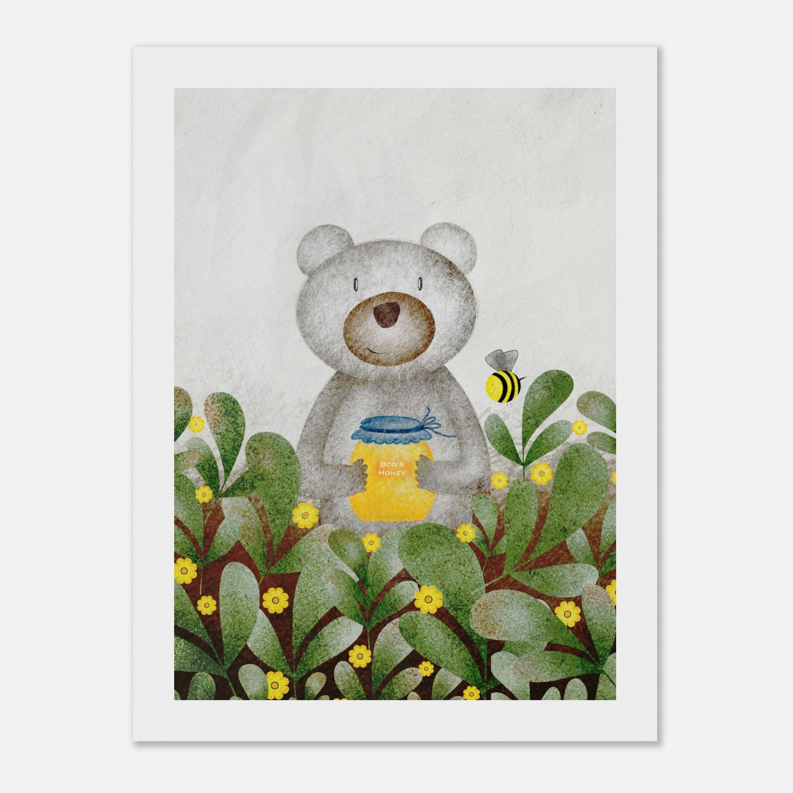 Sturdy and ready-to-hang wooden framed Honey Bear illustration printed on premium semi-glossy paper that enhances colours with a subtle shine while protecting against fading from light and moisture.