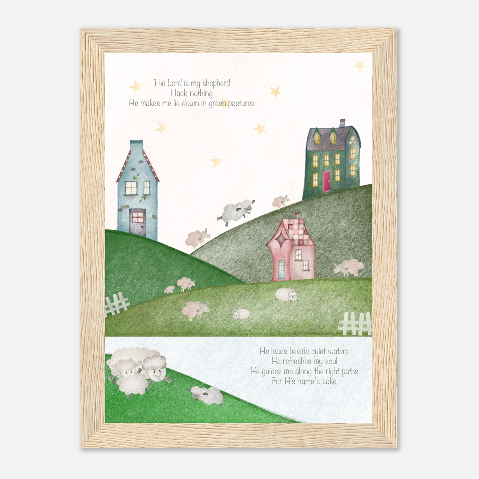 Sturdy and ready-to-hang wooden framed Psalm 23:1-3 illustration printed on premium semi-glossy paper that enhances colours with a subtle shine while protecting against fading from light and moisture.